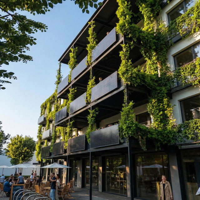 - Begrünte Fassade: Zur Verbesserung der Aufenthaltsqualität und Mikroklima-Wirkung im Umfeld.
