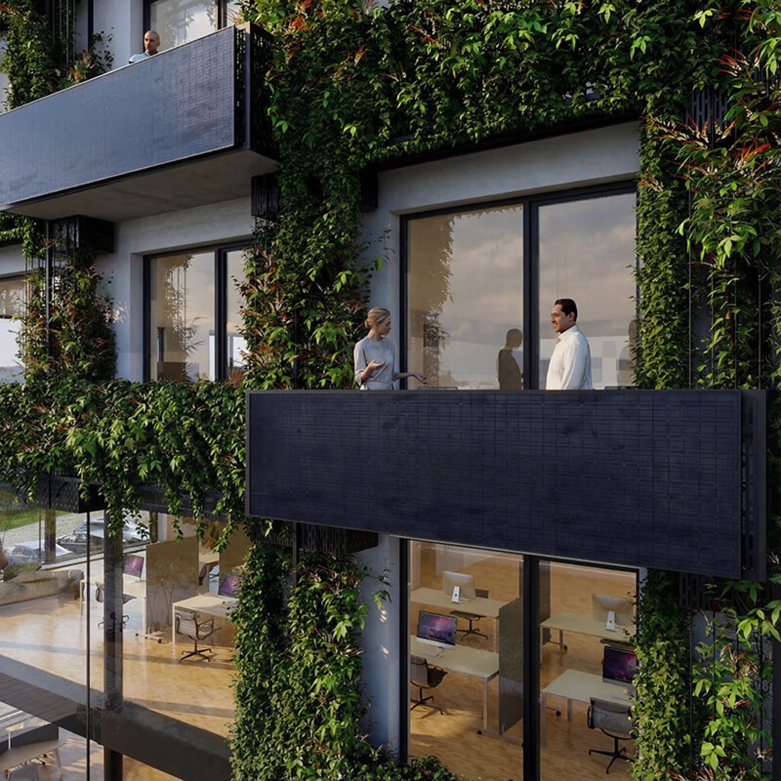 - Begrünte Fassaden zur Verbesserung des Mikroklimas und der Aufenthaltsqualität